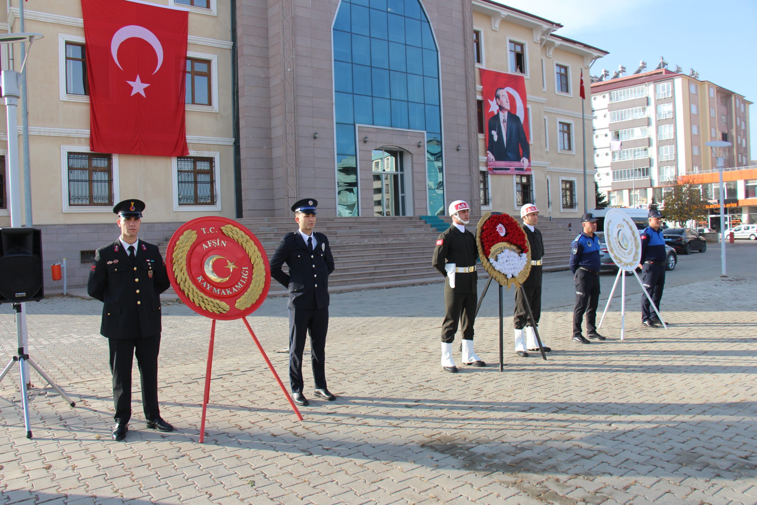 Afşin Hükümet Konağı önündeki Atatürk Anıtı’nda gerçekleştirilen törende, Afşin Kaymakamı Muammer Sarıdoğan, Garnizon Komutanı Yzb. Mahmut Keser ve Belediye Başkanı Koray Kıraç, Atatürk Anıtı’na çelenk sundu.